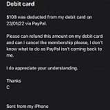 $108 was deducted on the 23th January via PayPal I also emailed them as soon as just like 5 mins after they notified me that they have taken money no one came back to me as well so they all worse no wonder they work together. I really need my fund I am behind with my rent and at least have compassion Katie.
