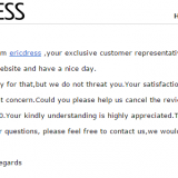 I went to my in box and received a message asking me about Eric Dress. When I independently (closed my mail) and viewed sitejabber through Google, and viewed my inbox, 'Sitejabber' I had NO queries. Do not respond independently of this website. I state again and again, if you want something good buy it local where you can fit it, and see it, and return it with no hassle, it may cost more in the moment, but worth it in the long run, at least you obtain the product, and see the quality. All these good reviews I suspect are being posted by the company to make themselves look good. I never did receive the item, but like I stated before I did get my money back through PAYPAL, as I escalated the claim before the time ran out... BUYER BEWARE
