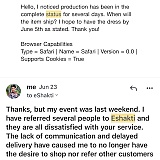 Ordered 3 items on December 29th with a posted delivery date of January 17th. Contacted eshakti.com using their customer service section on their website and direct email multiple times requesting a status update. Also called their customer service number numerous times but the mailbox was full.