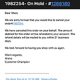 That customer service rep did cancel the order and sent me a confirmation canceling the order, then told me I would receive a separate email about my refund. It's now been 2 weeks and I have not received any money back or any emails, and once again nobody is responding to my messages or my voicemails.