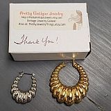 I purchased a pair of earrings on Etsy. The ad said large, in most peoples mind large is large. However shop owner PrettyVintageJewelry thinks that large is small to medium. After receiving the earring and contacting her for return. She informed me she does not take back any purchases under any circumstances. BEWARE OF THIS SELLER! Etsy customer service was ineffective and sided with the seller. You be the judge, my Gold earrings in the photo and her "small" silver earings on the left... DON'T take a chance on this seller, you will regret it!