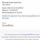 I bought tickets for a show in Vancouver online. My boss called and told me that I had to come to work the next day so I had to cancel the tickets I just bought. I did what I was told to do to receive a refund only to get an email after the show was over saying that my refund was declined and the reason they gave was "no refund!" And now I can't get ahold of anyone. Don't buy or get anything through these Eventbrite!