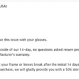 My glasses broke few months after purchased, and the warranty they cover is 50% in store credit for another glasses. So finally I had to spend more money in a new pair of glasses and I could only use this money in their website... This together with the terrible experience while buying my glasses makes me recommend NOT to ever buy from here.