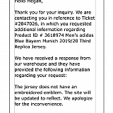 My third replica jersey did not have the embroidery that the site advertised. It was heat pressed and basically looked like a sticker. After processing an item check I received an email apologizing for my "inconvenience". However, I am expected to wait for my return even after the team admitted to messing up my order. Not only was I "inconvenienced" but now I don't have the money nor the product because it takes 10 business days to receive the product I returned. I am baffled to find out this is a licensed seller. Never will purchase from fanatics again.