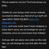 I placed an order for my family for Super Bowl jerseys where the site promises to deliver by the Super Bowl. Well, tomorrow is the big day and my order is still in NY instead of in California. I've been communicating through emails and the last one said they were going on "holiday" from 2/8/24 until 2/20/24. Buyer beware!