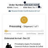 So I ordered a Philadelphia Eagles Sweater and hat gift box set to be delivered b4 Xmas on dec 22nd I places my order on Dec 17th I got an order confirmation email so I'm thinking everything is okay I check my emails and the Fanatics app daily but never received any shipment notification I finally call customer support on Dec 21st to inquire about the status of my package and was told that it's still being processed and that I most likely won't receive it by the 22nd and that I will not be able to cancel my order I ordered that as a gift for my son who loves the Eagles and wanted to be able to surprise him being as though we were recently reunited after 10 years. I'm extremely disappointed in the service I received from Fanatics and will never again order anything from their website nor will I recommend them to anyone