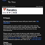 I ordered twice from fanaticswebsite and both times they canceled my order due to me having items sent to two different addresses. Then they want to tell me that they think somebody is using my card and ask me to verify my number and address info and the exact price and item in detail everything was correct …. Since when did they start canceling items due too different items being sent to different addresses. Since when does it become illegal to send multiple items to different addresses especially during these holidays? They apologized for the inconvenience give me a code that's discounted for 30% and when i go to use it on my order it tells me sorry we couldn't use this discounts on certain items in your order bull - ish if you ask me i will no longer be purchasing from them at all.