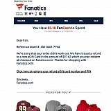 I contacted customer service for a return as fanatics has this 365 day return policy (it sounds great to the uninitiated, but you find out otherwise quickly) to request a return label. During the call the CSR and I discussed how I'd like the refund to be processed, giving me an option of store credit or a refund to the card processed. I opted to have the money refunded to my original means of payment and went about my day. Nearly ten days later, no refund had posted. So I contacted customer service and that CSR told me to give it 48 hours and if it hadn't posted yet to give them a call back. 72 hours later I fire off an email asking about my refund. Within 15 minutes I receive a matter of fact email from some nameless employee that they refunded me on a gift certificate that they e-mailed me. Now I'm sure you're thinking - how did you miss an email like that? Well, two reasons. One, I had received an email already from them acknowledging the refund and that it would be applied to my card and reason two being that Fanatics literally sends anywhere from 4-7 emails, EVERY SINGLE DAY.