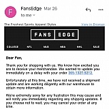 I ordered 3 shirts from fans edge for my kids. I was charged for all 3 then I get an email saying 1 of the items can be fulfilled. Email doesn't say which item. Next I get another email saying all items are shipping. The next day I get a credit on my credit card. I still have no idea which item could not be fulfilled. I've been trying to contact them to find out but they make that almost impossible to do. I won't ever use them again. Not worth the hassle