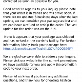Answer: Out of the six times I ordered from fashionova I received my items four times the two times my order never arrived I received no assistance from them but a vague response and no follow up when I e mailed back. They offer no refund or assistance at all when trying to locate a package you will have to work with your bank in order to get some resolve, pathetic company who only ensures celebs are getting items delivered and satisfied while everyone else they treat as peons who they can care less about. If your not insta famous they don't ensure a smooth customer experience for you and you will soon be left disappointed. Great merch but not worth the frustration.