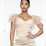 You can't return anything you bought on sale. The clothes might not fit. The quality also just feels cheap. This dress isn't what's advertised; the material and colour are very different from the picture. The colour isn't the same and the quality is different. It doesn't even look like the picture and it doesn't change when you put it on. And this nude blouse is way shorter and cropped in real life when you wear it.