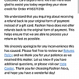 Answer: I received a full refund via original form of payment which was Paypal. I emailed them daily, reported them to the Better Business Bureau and opened a claim with PayPal. They sent me a store credit but I refused it and threatened legal counsel. Money was refunded in full 3 days later. Do not let this establishment bully you.