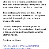Then I get ANOTHER return email saying " The quality of the products we sell is of utmost importance to us. Unfortunately, our fine jewelry and watch specialists found dents and scratches due to wear. If we believe this quality control issue may cause concern with our clientele, we will err on the side of caution and return it. Thank you for your understanding."