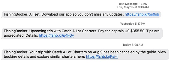 Do not use Fishing Booker! I booked in May for a halibut trip in August in Homer, AK. Flew to Anchorage, and drove 4-hours to Homer in a rental car. Stayed in a hotel. Got up early and had my wife drive me to the dock. The directions to find the boat in the Fishing Booker app did not include dock or slip number, but showed a map location. I went there. No boat. Looked for the charter boat company on google and went to location on map. No boat. Texted and called captain repeatedly. No response. Called Fishing Booker's help line. No answer. The boat was supposed to leave at 7am. At 8:09am I received a message that the trip was cancelled. Got a call from the captain saying he let Fishing Booker know several days prior that the trip was cancelled. Not message of cancellation was sent to me before the trip. In fact I received a reminder confirmation text the evening before. Do not use Fishing Booker. Book through the charter companies directly. Cut out the middle man and save yourself a huge headache and expense.