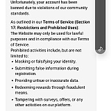 Update: still after asking for verification, I still am just told I violated the TOS. The latest is them copying and pasting TOS. I have explained how this did not help and is not relevant to me. (See last two pics)The reason they cannot give a specific answer is there was no violation. I carefully review terms of service before signing up and stay within guidelines. Then after several changes in reason, they start ignoring you and ending conversations without response.