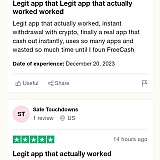 Scam company! My Freecash id *******. I was shadow banned for trying to withdraw my money, then ignored by support. I noticed they have people posting 5 star fake reviews for them I've screenshot from the TrustPilot website, screenshots provided for my interaction with support and the fake reviews. BEWARE!