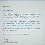 It is to inform you that I have just received the e-mail notifying me about the reopening of my freelancer account. I am highly obliged for this favor of yours. I regard this commendation and this support.