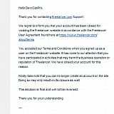 Answer: Freelancer is scam. I have very bad experience recently. "The payments you've received from your employer "-----------" were reversed due to their account issues. As a result, their account was closed" Lost over 800$. Freelancer also keep the fee for this job! Their support never answer. SCAM