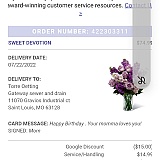 Placed same day order with them on 22/7 they didn't deliver reason being they didn't have a local florist on 23/7 they didn't deliver reason being they didn't locate the address/owner on 24/7 gave them contact to use which they never called, they are always have fake excuses to make buy flowers with them at your own risk they will never deliver and will always give fake excuses