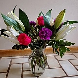 This was the second time I had problems with an order from this company. I chose the best value of a florist designed bouquet at the mid range price for Easter. What arrived was beyond unacceptable. Three red and two white carnations with fern filler in a tiny 5 inch high vase., Dont order from them. The picture shows what $54 got me.