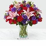 Description from website: "Comprised of vivid red roses, purple double lisianthus, pink lilies and red spray roses within a clear glass vase, vibrant color bursts from every bloom...".