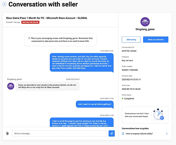 I purchased what I thought was a Game Pass key, but it turned out to be an Xbox account. As soon as I noticed the mistake, I requested a cancellation and refund immediately. G2A ignored my requests and instead, the seller claimed they couldn't help. I was forced to open a chargeback via PayPal, but PayPal sided with the seller, allowing them to keep my money. On top of that, I still haven't received the product I paid for because it's on hold. It's been a frustrating experience with no resolution. I do not recommend G2A due to their terrible customer service and unfair practices.