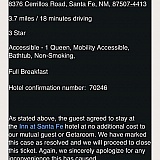 So, 3 days before I get to Santa Fe I called the inn of Santa Fe and they said no reservations in my name. So I get to Santa Fe and go to the hotel inn of Santa Fe (formally quality inn) on Carlisle avenue. They said the third party should have let you know we have a new owner and we can't accept the paid reservations but we have a room available for $150.99 (no rooms because of Indian market & all overpriced and booked) Call the third party and see if they will refund your money because they should have called all their customers & let them know that we are under new owners.