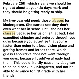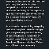My daughter traumatized by her dad US Army Vet Daniel Shane killed in 2022, struggled enough from his death as she stopped communicating now at 5 making progress but still Kindergarten is difficult accidentally broke her glasses. Her self esteem low due to her issues communicating and the awkwardness that comes with having a "angel daddy" school and friends are hard. I ordered a replacement for her glasses urgently as her vision is bad. Glassesusa advertised how fast they are. Order February 20th today it is March 12th, speaking with customer service every day getting disgusting responses and no help and broken promises I reached out to Daniel Rothman CEO on glassesusa as my daughter was at risk of being held back as she was missing work due to her vision. He had the nerve to not help me with the order just told me he talked with Jack Winter, but then turn around and offer $100 credit good for 6 months to give these crooks more of my money and time! Jack winter emails promising overnight delivery on the 12th and delivery on the 13th well no surprise they have not been shipped and called customer service and they can't do anything. My daughter now gets to repeat Kindergarten as this has tremendous impact on her education. She has suffered with feeling confident as she already has communication issues now she's had vision issues which have held her back from her class and she was finally fitting in and this situation has caused her so much trauma. Most horrible customer experience and consequence i've heard and to a daughter of a army veteran killed when she was 3! They aren't even USA based they are out of Jerusalem they should be banned from practicing business in the USA and my daughter should be compensated.