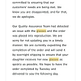 Our apologies for any inconvenience and we hope you are enjoying your new glasses.
