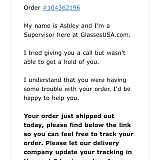I'm very disappointed in Glasses USA for the way the glasses arrived no box just threw in a bag not even any bubble wrap. Iit shows the lack of care even the green Ray Ban glasses case came bent out of place.you can even contact anybody to give feedback at this company only robot help. I doubt I will do business with this company again!