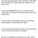 When I requested a refund for my second return, I emailed customer service to let them know that I wanted a refund for the store credit, only to be told that I'm not allowed to get a refund for my store credit, and because I'm returning glasses for the SECOND time, I won't get a refund, only store credit. Not to mention, the store credit lasts for ONLY 3 months from the date they send you the store credit code.
