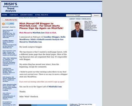 Mike Shedlock 's site where he discusses various things economics. Covers the world with some in-depth analysis. Very opinionated and likes to take on many government entities in the U.S. and Europe. Not reticent to call out the many liars and provides pretty good analysis with charts. Disagree or agree, makes no difference as he tells it as he sees it. He is especially caustic about the economic positions of chief financial ministers and other economists. Mr Shedlock works as an investment advisor, but has an excellent (imo) grasp of how fiscal policies actually work. For those who might like to get a second opinion from the mainstream media and government pronouncements.