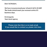I do not see why they cannot refund me the amount due as they a multi million pound company wait for the airline to issue them with their funds