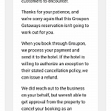 I spent the last 2 weeks talking with Groupon and the hotel I booked with to get a refund on our reservation as their was a natural disaster in our area so their water was off and no elevator to use. So they informed us that they will be happy to provide a refund but I have to got through Groupon to do so. After multiple customer service tickets with the General Managers information to waive their cancellation policy and provide refund they send me each time they tried to reach the establishment for refund but was denied approval and can't process a refund. Same automated email each time. Will never use their services again.