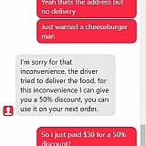 This is my second time ordering through GrubHub and it will now be my last! I placed a simple order with 3 items today and my evil driver never delivered it. I immediately got in contact with customer care and they informed me they could refund me but not do a reorder or give any coupons. Enraged I told them that I never experience this with any other food delivery companies I am always given the option to reorder and receive a coupon. But no, GrubHub is to cheap. They need to do a better job in their hiring process, my driver lied and told customer care that she did come up to my door and knocked and called but she claimed I never answered. Lies! Her story is even worse because while she was driving to my house I texted her and gave her directions to leave my food on my front porch. She completely failed to do this. I asked customers care if they could track her gps and see if she ever even came but they did not have the power to do that. Despite my bad experience they still said no to coupons or redelivery. I don't know why they couldn't give me any damn coupons or a reorder.