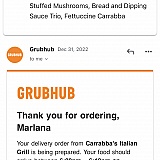 By that time Chili's had run out of ribs and our entire meals were late. Grubhub gave us a $5 credit when they should have refunded the whole order amount! Grubhub ruined our Christmas Eve meal and we will never ever use them again! All of our friends know about this, as well.