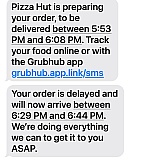 I ordered pizza hut on 6/5/24@5:29:55PM through grubhub Amazon prime to be told it would be here no later than 6:08. Then I got another text message stating that no later than 6:44. Then I hit the track button when it still wasn't here and it said it would be delivered by 7:14. Once we finally got the order the pizza was ice cold. I also found out that GrubHub charges more than what Pizza Hut charges plus they may deliver for free but they are charging a service fee as well as automatically add a 20% tip that you can change. So excluding the tip GrubHub charged me $36.77 where had I picked it up from Pizza Hut it would have cost me $26.75 so there is a $10.02 difference. Pictures included. Horrible!