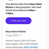 This was my first and last experience with Grubhub. Food was supposed to take 30 minutes, but took 1 1/2 hours. My driver was named Diana, but when it arrived, a man handed it to me, and a minute t later I got a text from Diana saying she had left the food on my porch. The food was cold, and part of the order was missing. Bad experience from beginning to end. Can't imagine using them again.