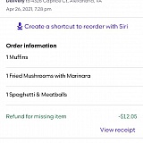 After paying for a $36 order and receiving not one thing right on said order, the only refund given is for $9.60 for one missing product. Pot stickers ice cold. No sauces for any items. Missing orange chicken and no chow mein noodles. Refunded for only the missing egg rolls. The ENTIRE order was incorrect and we were not able to eat anything and GrubHub does absolutely nothing. The restaurant does nothing because it's gone through a third party but the third party doesn't do anything either. Your out almost $40 and have no food to eat... and their answer is "all we can refund is for the missing item". They don't even give you an option to get the food re delivered. I'll never use GrubHub ever again.