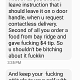 I got a violent grubhub delivery guy who sent us threatening texts when we asked him not to leave our food on the floor, which he did. I sent the texts to GRUBHUB and they IGNORED the email. That's right! THEY IGNORED US AND TOOK ZERO ACCOUNTABILITY. I WILL NEVER ORDER FROM THEM. THEY ARE THE BY FAR THE WORST COMPANY I'VE EVER DEALT WITH. I've posted some of the driver's texts. His name is LEONID and he works in BROOKLYN, NY.