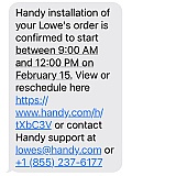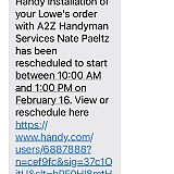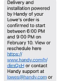 They are terrible service and Lowes should be ashamed for using them. First, they scheduled a toilet installation for 10 days out. The 10th day came and I called and the installation guy said he thought someone else took the job. I complained to Handy and was told they would send someone the next day but then got a message saying it would be 5 more days and that appointment was going to also be rescheduled. It's the worst customer service I've ever experienced because of the broken English they speak. I had bought the service February 1st.