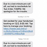 Horrible don't get there service said there handy professional canceled twice on me and rescheduled for only days they want and times or cancel on you again it seems beyond mad. Oh and said I'd hear back within 15 min of them waking me up to another cancel notification. They also cancel two hours before your apt