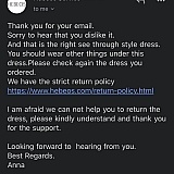 I purchased a rehearsal dress for my wedding from this site, the day it arrived I pull it out of the bag and honestly thought they sent me the wrong dress. It was not the materials listed in the description, and it was SO SO SO cheaply made. The top was completely see through and all you notice are these huge bra pads LOL So within an hour of trying on the product I emailed them asking for a return. Because in the return FAQs right below the item itself states "If you are not satisfied with the product we have an easy 7 day return policy" (or else I would not have bought it! We went back and fourth for a while fighting this return and sometimes there response was just saying sorry then nothing. But the one that they sen me that stood out was this