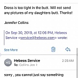 Here's the email correspondence! Dress was too tight in the butt and legs! She couldn't walk in it. I tried to take it back and they want pictures of my daughters tight butt to prove it!