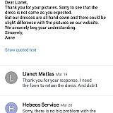 I placed an order in hebeos.com in February and to my surprise when the dress arrived a few days ago, the dress was far from what I expected. I have written a number of emails to the company to process the refund and the very thieves told me in the first place that they would not return anything and after many complaints that I have made, they reply that they can only return 10% of the that I spend on the dress. What kind of disrespect and thieves are they? Do not buy anything on this website. Nooooo buy them anything. In the picture you can see the kind of thieves they are.
