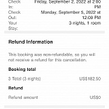 Thank you for leaving a review. We're sorry to hear about your experience. We can see that this concern has been addressed by our Hotel reservation team. Your booking was successfully cancelled and refunded last Saturday. If you have any further questions or would like to share any additional information with us, please contact us via Twitter@HopperSupport or any of our social media channels, and we will gladly assist you.