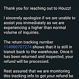 Terrible company. DO NOT buy anything from them. You would regret it big time! I rarely write reviews; however, what they made me go through is so shameful, so I want everyone to know. I bought a sectional from them, and after a month, one of the century's biggest earthquakes happened in Turkey. My family and friends were also in the affected area, so I had to move out immediately to go back. This item is one of the biggest purchases, and I had no place to store it - and the return period passed only a week. Companies like CB2 did not even second my request; the moment they heard what happened, they sent someone the next day to pick up my rug, coffee table, and media console and sent me a full refund immediately- and my return period passed almost 2 weeks with them. They were super kind and understanding. BUT HOUZZ! They kept making me call them, their customer service representatives were so rude, and their Supervisors were lying big time! They said it's not them; the supplier is not accepting the return, but I called the supplier directly, and they kept telling me they requested them to help me out, but HOUZZ is rejecting the request. In an event like this, where that money will be used for people in need, where this company stand is so embarrassing. They have no value whatsoever, and I am so regretful of ever doing a transaction with them. You wouldn't want to do business with companies like this. The fact that they made me go through all this process while we were also suffering on the other end is utterly unacceptable. SHAME ON YOU, PEOPLE OF HOUZZ!
