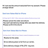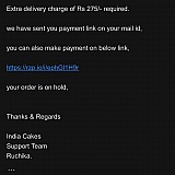 I ordered a cake from India Cakes. At the time of ordering, there was no mention of extra delivery charges. A day before the deliver date, they reach out to me saying the delivery address is to far and I need to pay an additional Rs. 275 for them to be able to deliver. I dispute this saying this wasn't mentioned at the time of placing the order.