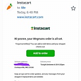 I placed an order through Instacart App around 6 PM Saturday evening for items from Wegmans. Delivery was supposed to be 6:50 to 8:30 PM. At 8:35 PM I sent a text to Freddy, the shopper and driver asking about my delivery. The response was "I'm on my way".