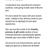 I am disabled and needed a service like this. Shoppers do not follow instructions. Left food in lobby. Would not carry to apt door and expected me to ask a neighbor! Refused to send someone back and offered a $5.00 credit on a $156.00 order. Missing items…no bread? What store doesn't have bread? Never use this service. Horrible shoppers, customer service and prices are ridiculous. Charge "heavy charge for a case of water yet expect a disabled person to carry it upstairs'. BOYCOTT INSTACART!